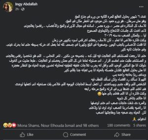عبّرت إنجي عن حزنها من الوضع الذي تمر به، قائلة: «الدكاترة رافضين يعالجوني»، لكنها في الوقت نفسه أكدت إيمانها بأن محنتها اختبار من الله، وأنها تحاول التماسك والالتزام بالدعاء، متوجهة بالشكر لكل من ساندها ووقف بجوارها خلال هذه المرحلة الصعبة.